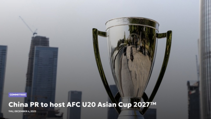 12月04日讯 亚足联官方宣布,中国将承办2027年的U20亚洲杯。