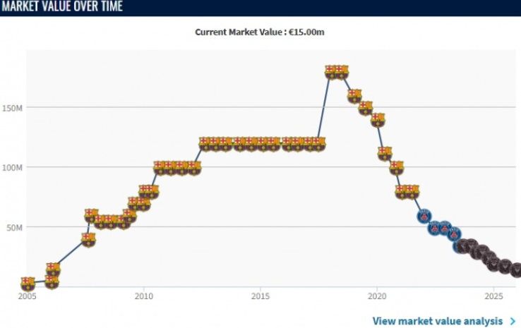 梅西的身价在2018年30岁时曾高达1.8亿欧元,是其生涯峰值。如今,尽管身价降至1500万欧元,他仍是全球同龄球员中身价最高的。