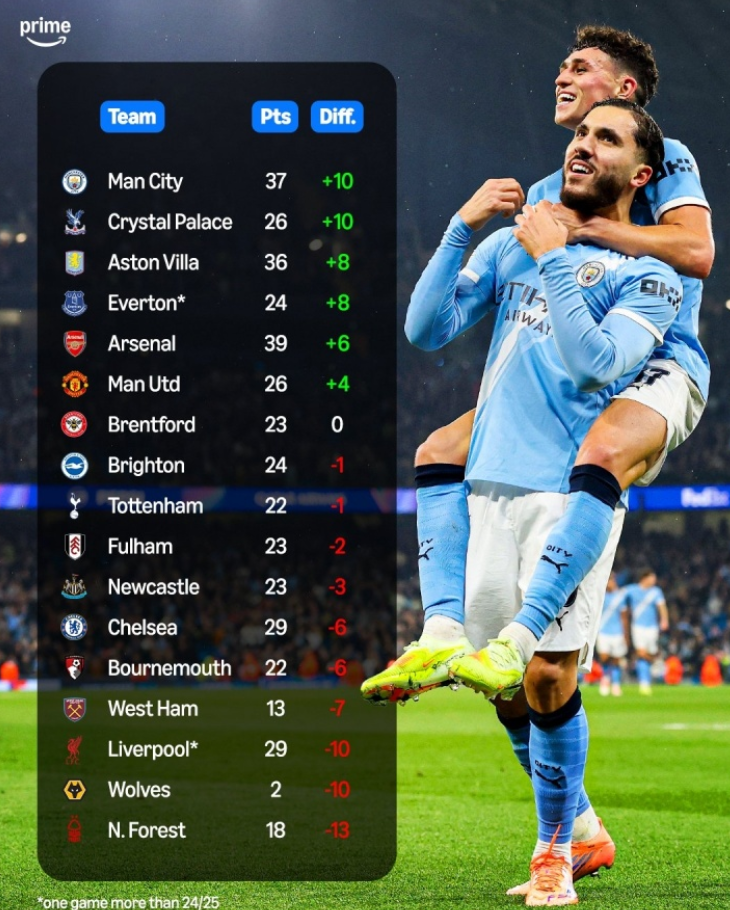 数据显示,曼城与水晶宫相较上赛季同期均多拿了10个积分,是进步最为显著的两支球队。阿斯顿维拉与埃弗顿紧随其后,均比去年同期多8分,阿森纳多6分,曼联多4分。