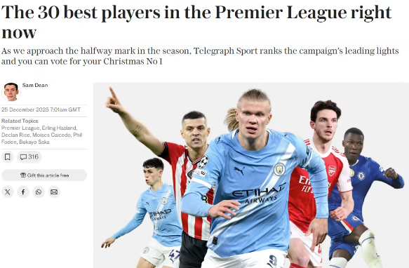 英国《电讯报》近日评选出本赛季英超至今表现最佳的30名球员。在榜单前10名中,领跑积分榜的阿森纳有2人入选,紧随其后的曼城则有3人上榜,其中哈兰德高居榜首。曼联仅有一名球员进入前30,队长布鲁诺·费尔南德斯位列第26位。